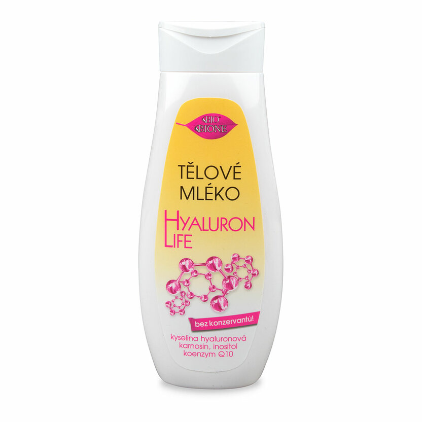 Prípravok je vyrobený v BIO fomulácii bez SLS, SLES, neobsahuje ropné produkty, parabény, ethoxyláty ani silikóny, je použitá hypoalergénna parfumácia. Prípravok je šetrný k Vám i prírode! Žiadny iný výrobok nemá zloženie ako Bio BIONE Telové mlieko Hyaluron Life. Konzervačná látka sa po použití výrobku postupne úplne odparí.